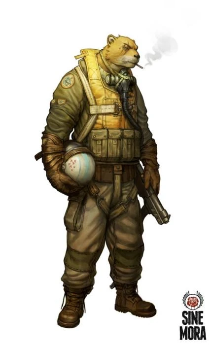 Argus Pytel takes the appearance of an anthropomorphic wolverine.[1] He has a strong build and is seen in his first official artwork wearing a pilot's uniform, carrying a helmet and a gun, and smoking a cigarette.[1] Described as the most talent Imperial Intelligence profiler,[2] he is a high-ranking Collaborationist officer of the Layil Empire.[1] Pytel is said to be both a "conservative gentleman" and a skilled fighter pilot; he is also known to be extremely intelligent.[1] Pytel's blood type is AB.[1]