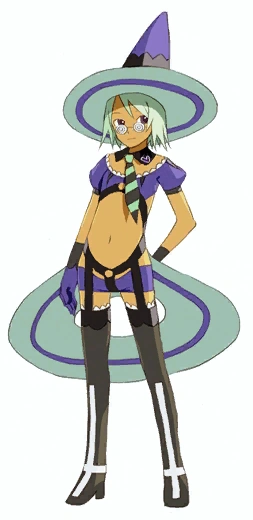 For Bizarre Jelly 5, the anime's incarnation in No More Heroes 2: Desperate Struggle, Blueberry's appearance changes radically. She no longer wears glasses over her eyes, which have changed from purple to pink, and her pointed hat and necktie are also absent. She also now wears a white bra and white shorts, and her gloves have become entirely purple. She has also opted out her black boots for greenish leggings. Lime green rings now scale her wrists and ankles as well.