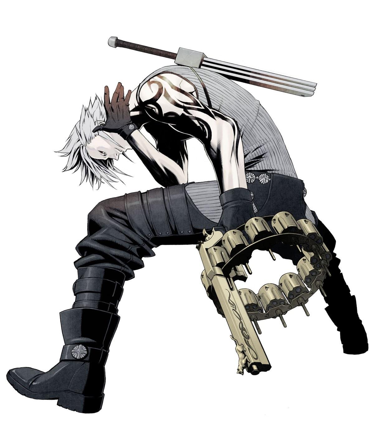 Helter wields an elaborate revolver consisting of a ring of 12 six-chamber cylinders. He also uses a large beam katana with three parallel blades. Because of its compact size, Helter's blade is capable of swift and accurate strikes.
